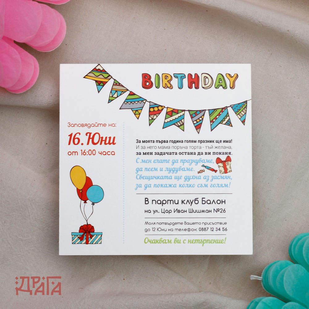 С дизайна и тематиката на веселите покани можем да изработим за тържеството празнична декорация и всички печатни аксесоари, които въображението ви пожелае!