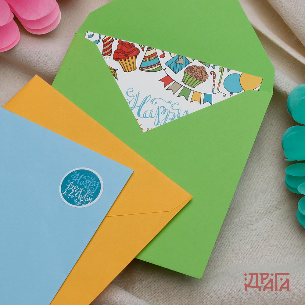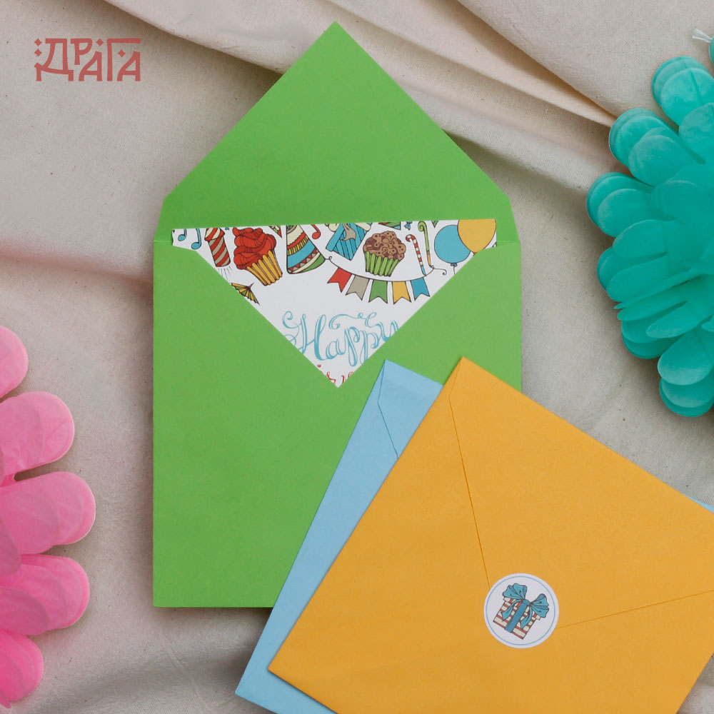 Подходящ плик по избор от четири искрящи цвята, запечатан с шеговит стикер,