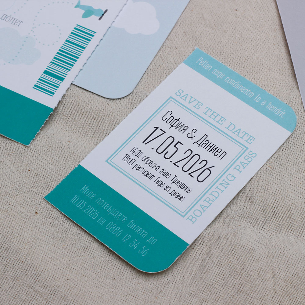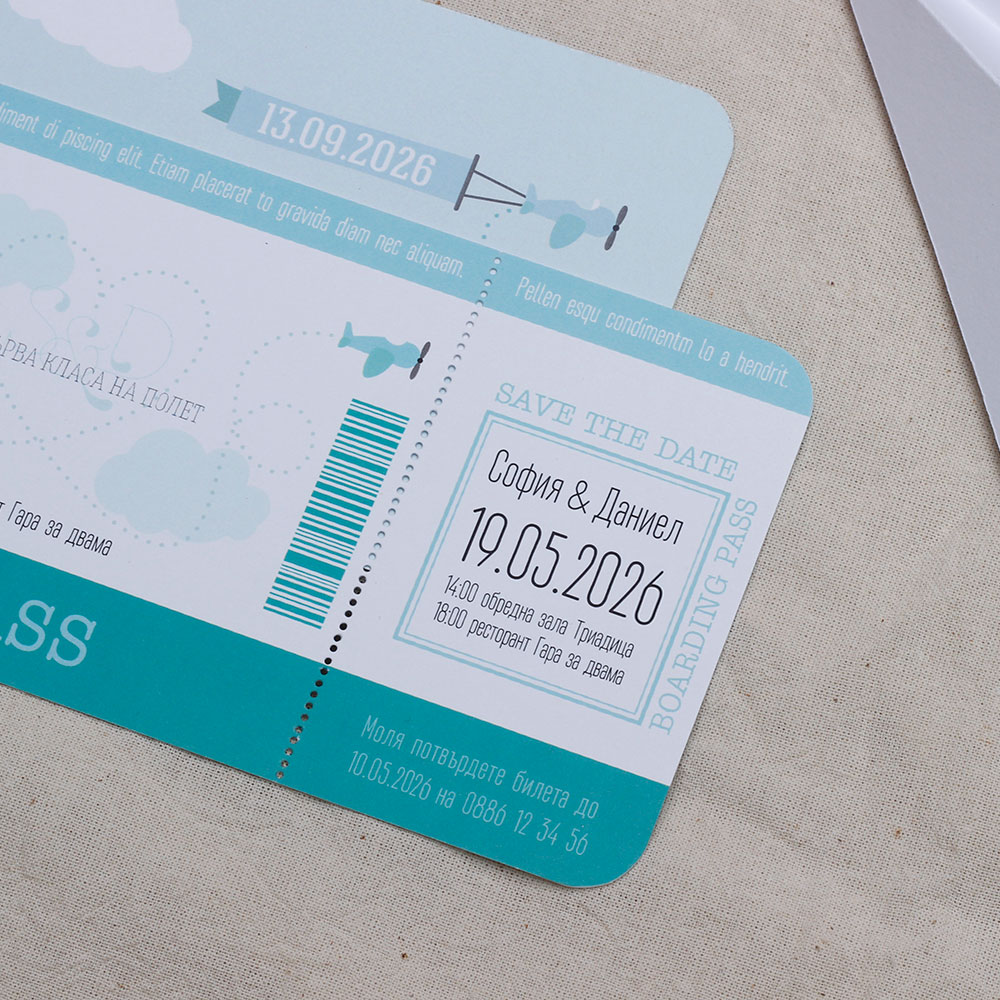 Поканата за съвместен полет в паметния ден е оформена като бордова карта в тюркоаз,